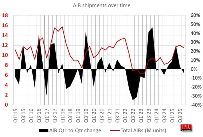 По данным JPR, общий объем поставок видеокарт от партнеров (АИБ) упали на 4,4% по сравнению с предыдущим трехмесячным периодом, составив 11,48 млн единиц. В годовом выражении он вырос на 36%. Аналитики объясняют падение поставок в четвертом квартале ростом цен на память, а также таможенными сборами. JPR также отмечает, что доля дискретных видеокарт, установленных в настольных компьютерах, упала на 12,3% (до 55%) по сравнению с предыдущим кварталом, а поставки процессоров для настольных ПК выросли до 21 миллиона единиц.