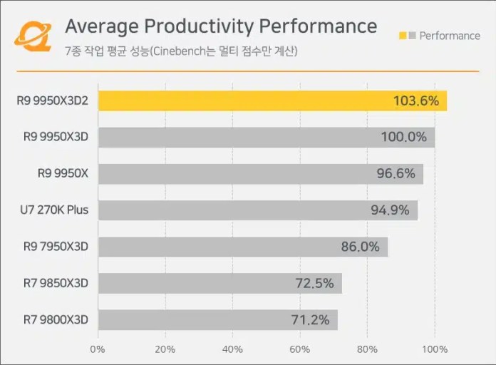 Результаты Quasar Zone показывают, что Ryzen 9 9950X3D2 не демонстрирует улучшения игровой производительности и находится на одном уровне с Ryzen 9 9950X3D, Ryzen 7 9850X3D и Ryzen 7 9800X3D при сравнении в нескольких играх с разрешением 1080p. Под рабочими нагрузками прирост производительности составляет всего 3,6% по сравнению с 9950X3D.