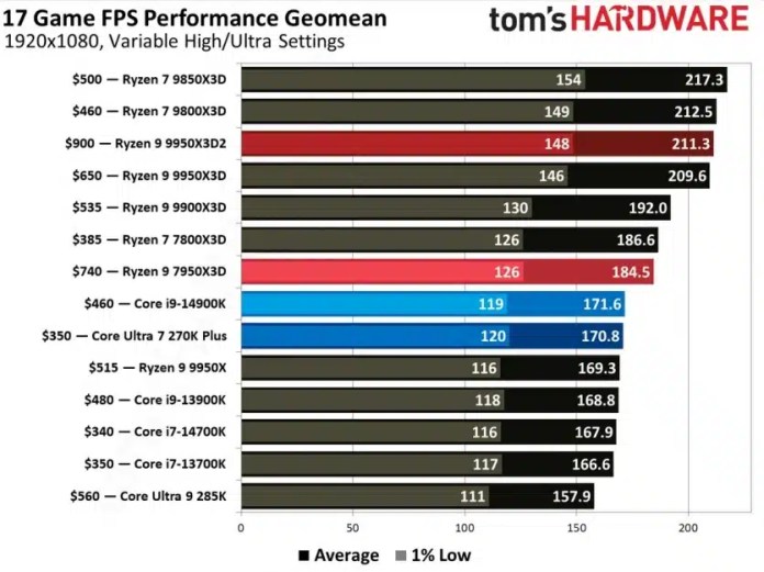 Флагманский процессор AMD Ryzen 9 9950XD2 стоимостью 900 долларов показал худшие результаты в тестах игровой производительности, чем более дешевый Ryzen 7 9800X3D.