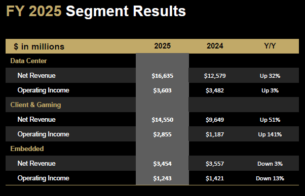 Значительным отличием является сегмент встроенных решений, основанный на наследии Xilinx. Базовая выручка выросла на 3% до $950 млн в четвёртом квартале, но упала на те же 3% до $3,5 млрд к концу 2025 года. По мнению AMD, это связано с корректировкой запасов.