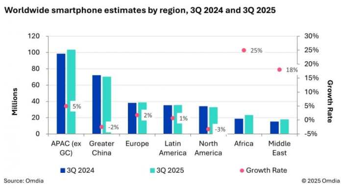 Рост продаж Samsung был обусловлен запуском Galaxy Z Fold7 и Flip7, а также A07 и A17. По мнению аналитиков Apple, базовый iPhone 17»превзошел ожидания выхода на рынокПродажи Xiaomi в Китае снизились после окончания программ государственного субсидирования, однако это снижение было компенсировано ростом в Азиатско-Тихоокеанском регионе и других странах. Vivo сохранила сильные позиции в Индии и обогнала Huawei в Китае, продолжая при этом увеличивать продажи в Азиатско-Тихоокеанском регионе, Африке и Латинской Америке.
