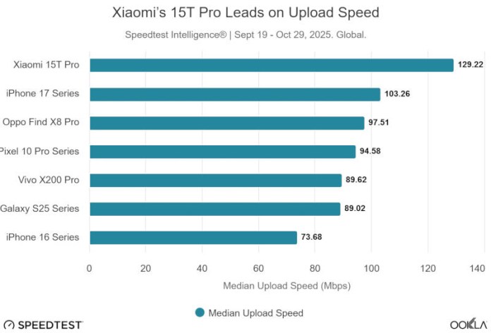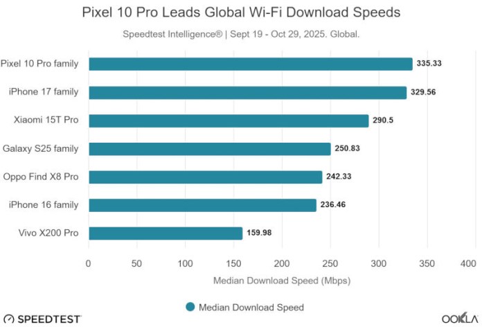 Смартфон Google Pixel 10 Pro с беспроводным чипом от Broadcom показал самую высокую медианную скорость в мировом рейтинге — 335,33 Мбит/с против 329,56 Мбит/с у iPhone 17. Смартфон Samsung Galaxy S25 с чипом Qualcomm FastConnect 7900, интегрированным в платформу Snapdragon 8 Elite, не смог показать рекордные скорости, но имел самое низкое время отклика: 6 мс в Северной Америке, 7 мс в Европе и 9 мс. мс в странах Персидского залива