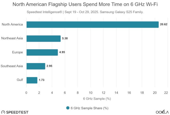 Из всех регионов мира подключение Wi-Fi 6 ГГц чаще всего использовалось в Северной Америке, где на его долю приходилось 20% измерений — по сравнению с примерно 5% в Европе и Северо-Восточной Азии, 2,95% в Юго-Восточной Азии и 1,73% в Персидском заливе. То, что узкий диапазон iPhone 17 не является проблемой, подтверждают результаты тестов в Северной Америке, где этот смартфон оказался самым быстрым на 50-м и 90-м процентиле: 416,14 и 976,39 Мбит/с соответственно.