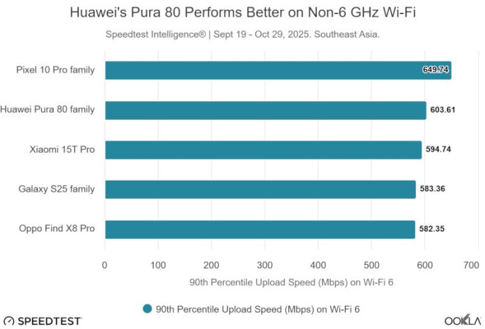 Наконец, Huawei Pura 80 наглядно показал, что диапазон частот 6 ГГц, который не поддерживает этот смартфон, — это не маркетинговый трюк, а рабочий способ увеличить скорость соединения. Отсутствие поддержки диапазона 6 ГГц особенно заметно в 90-м процентиле, где Pura 80 отстает от всех остальных устройств в Юго-Восточной Азии, где он имеет самое широкое присутствие, но успевает достичь лишь 541,33 Мбит/с на входящем канале, что на 39% меньше, чем у Oppo Find X8 Pro, возглавляющего рейтинг. Однако в рейтинге точек доступа без Wi-Fi 6E и Wi-Fi 7, то есть без 6 ГГц, Huawei Pura 80 занимает почетное второе место.