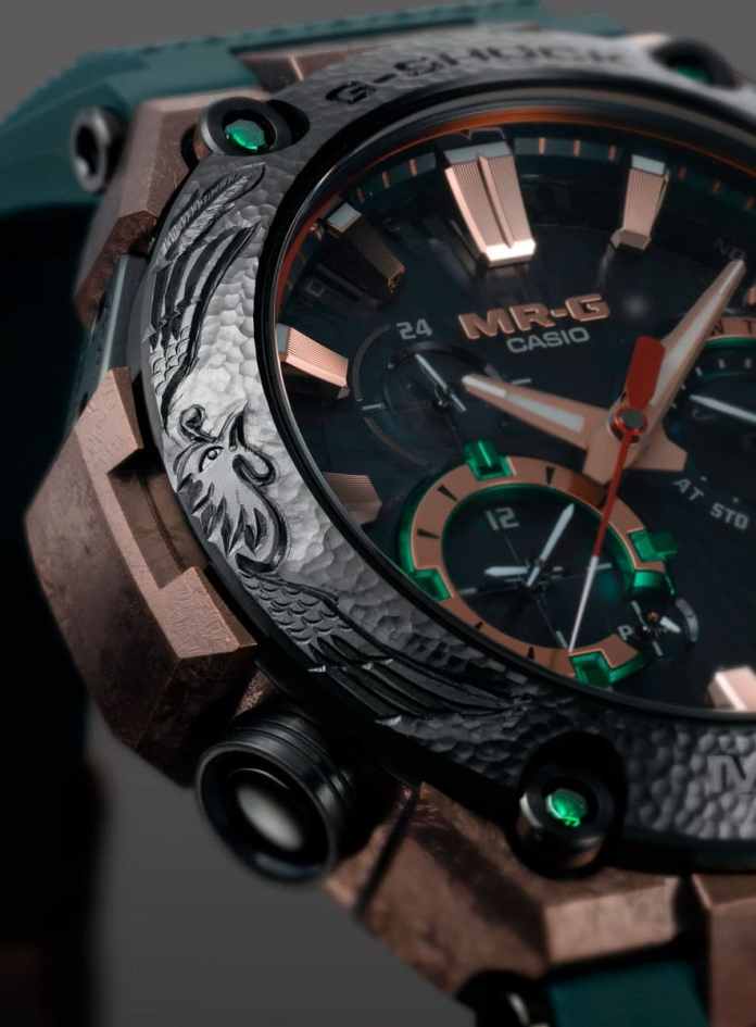 Сердцем этих часов является титановый безель, вдохновленный цубой, традиционной гардой японского меча. Но самое удивительное то, что каждый безель изготавливается вручную. Мастера используют древнюю технику гравировки Сиши-Айбори, используя молоток и долото, чтобы создать на поверхности металла изображение мифического феникса. Это означает, что в мире не существует двух одинаковых часов MRG-B2000KT-3A — каждые часы уникальны, как отпечаток пальца.
