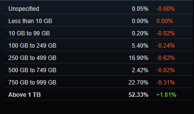 Если посмотреть на общую картину, то доля пользователей с 32 ГБ оперативной памяти увеличилась до 38,02%. Самой популярной конфигурацией среди геймеров по-прежнему остается конфигурация с 16 ГБ ОЗУ — 40,24%, однако ее отрыв сузился до 2%. В системах с 64 ГБ ОЗУ также наблюдался небольшой рост на 0,04%.
