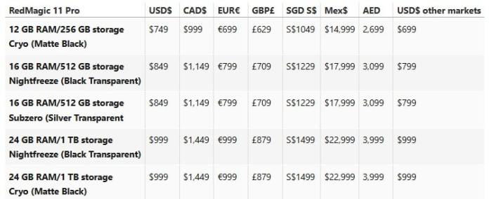 Рекомендованная цена устройства в конфигурации с 12 ГБ оперативной и 256 ГБ постоянной памяти составляет $699. В максимальной комплектации с 24 ГБ ОЗУ и 1 ТБ постоянной памяти цена смартфона составляет $999. Цены на другие конфигурации можно найти в таблице выше. Интересно, что в США цена смартфона начинается от 749 долларов США.