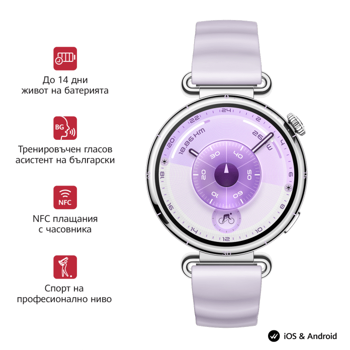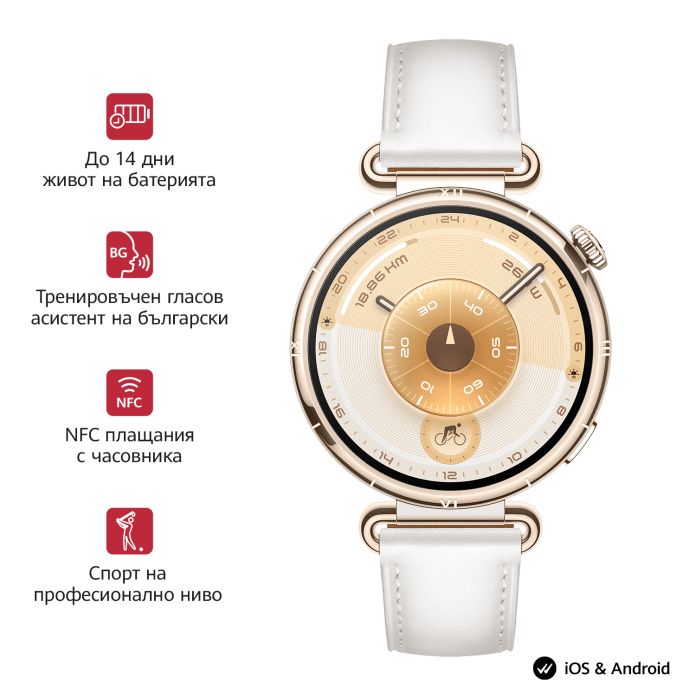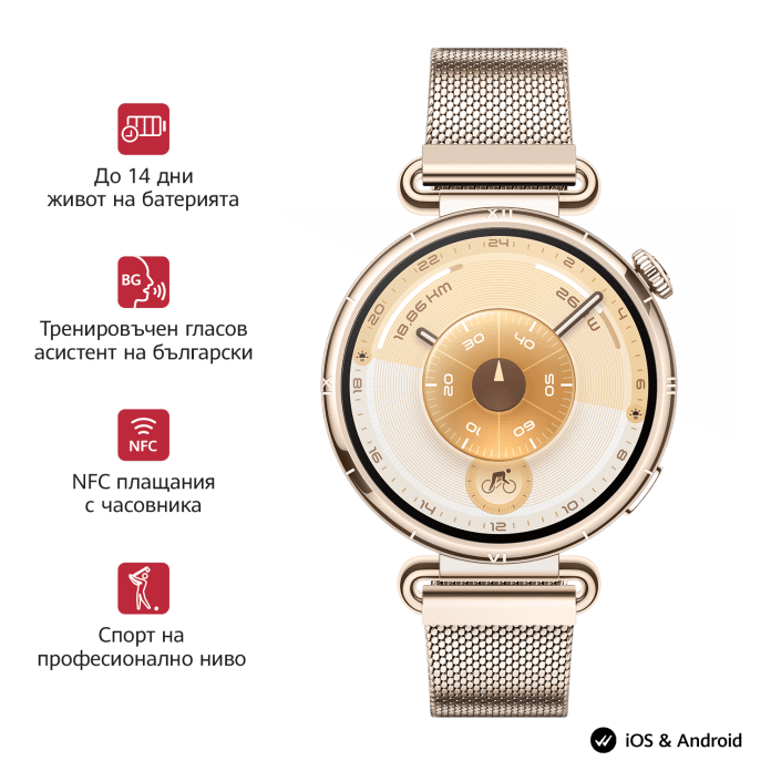 В повседневной жизни GT 6 ведет себя как настоящий помощник. Вы можете принимать звонки Bluetooth, просмотреть сообщения, управлять музыкой с вашего телефона и использовать голосовой помощник. Платежи NFC доступны, в том числе через Quicko в Болгарии. Камера телефона можно управлять дистанционно через часы, а на экране показан прогноз погоды, фазы луны, восходы солнца и приливы.