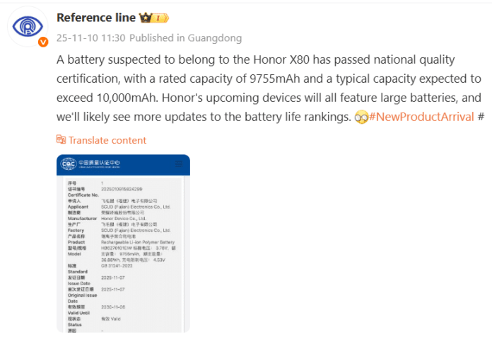 Эта информация не является просто слухами. Недавно китайский регулятор 3C сертифицировал новый аккумулятор, возможно, разработанный специально для Honor X80. Его номинальная емкость составляет 9 755 мАч, а это значит, что типовое (маркетинговое) значение легко превысит отметку в 10 000 мАч. Здесь интересно то, что компания идет на такой шаг, даже жертвуя некоторыми функциями. Инсайдер утверждает, что ни X80, ни другая модель с гигантской батареей — Honor Power 2 — не получат поддержки беспроводной зарядки. Вероятно, это сделано для экономии внутреннего пространства и удешевления устройства.