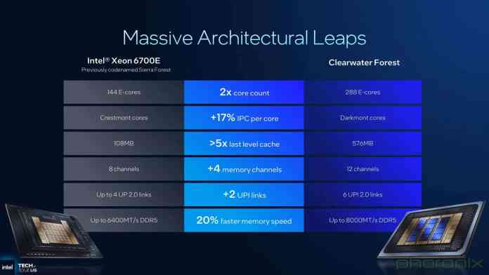 Intel утверждает, что Xeon 6+ обеспечивает в 1,9 раза большую пропускную способность памяти. Это достигается за счет сохранения высокоскоростных модулей DDR5-8000. Для сравнения, процессоры Sierra Forest поддерживают память DDR5-6400. Clearwater Forest будет предлагать до 576 МБ кэш-памяти третьего уровня (Л3). По данным Xeon 6+, он на 23% более энергоэффективен, чем его предшественники, во всех рабочих нагрузках.