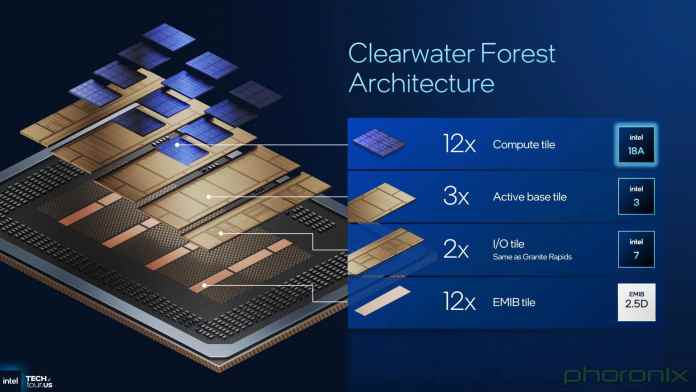 Clearwater Forest также использует новую упаковочную технологию Foveros-S. Он предлагает 3D-компоновку, которая, по словам компании, позволяет комбинировать несколько чипов и интегрировать их в усовершенствованный SOC, обеспечивая гибкость, масштабируемость и производительность на системном уровне. Процесс Intel 18a заложил основу как минимум для трех будущих поколений клиентских и серверных продуктов Intel.