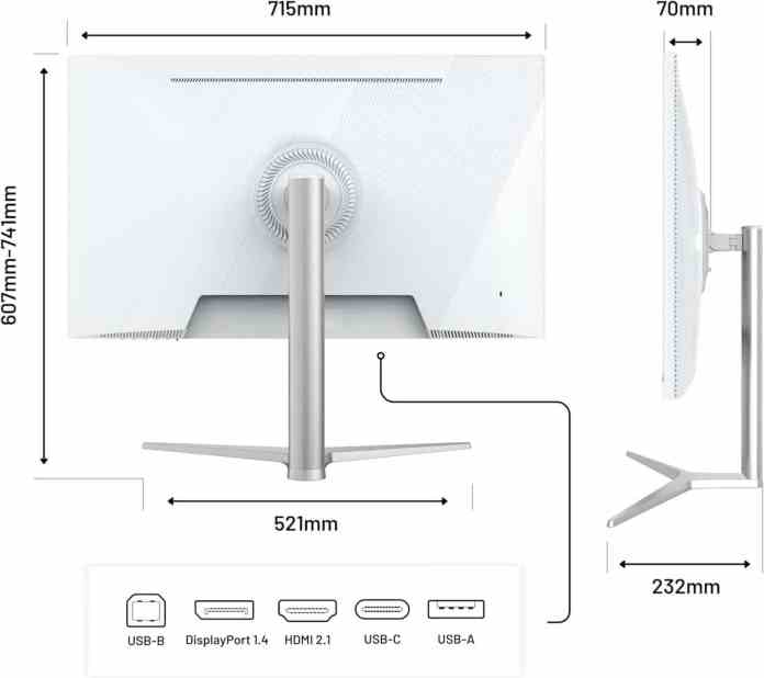 В набор внешних разъемов монитора входит один DisplayPort 1.4, два HDMI 2.1, один порт USB-C с поддержкой Power Delivery 90 Вт и два порта USB-A. Устройство также оснащено встроенными динамиками и универсальной регулируемой подставкой, совместимой с креплением VESA. Монитор поддерживает технологии синхронизации изображений AMD FreeSync и Nvidia G-Sync. Заявленное энергопотребление составляет 44 Вт в обычном режиме работы и 38 Вт в экономичном режиме.