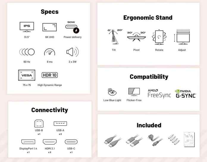 Технические характеристики выглядят многообещающе: 31,5-дюймовая IPS-панель обеспечивает разрешение 6016×3384 пикселей при соотношении сторон 16:9, что дает высокую плотность пикселей — 219 ppi. Однако частота обновления ограничена значением 60 Гц, что характерно для других мониторов с таким разрешением. В продаже есть только один монитор с разрешением 6K и частотой обновления выше 120 Гц: монитор Dell UltraSharp 52 Thunderbolt Hub Monitor (U5226KW). Однако размер экрана 52 дюйма и соотношение сторон 21:9 делают его непригодным для прямого сравнения.