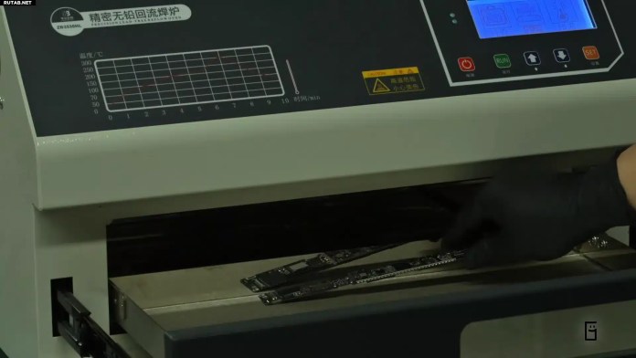 Самая сложная часть осталась позади, и затем Директор Фенг подключил ноутбук к другому MacBook через USB-кабель для прошивки macOS. После завершения тестов он выключил ноутбук, чтобы нанести клей BGA на новый чип, затем всю материнскую плату поместили в печь для запекания, чтобы клей как следует зафиксировался. Плату вернули на место в корпусе, все разъемы прикрутили и устройство собрали.