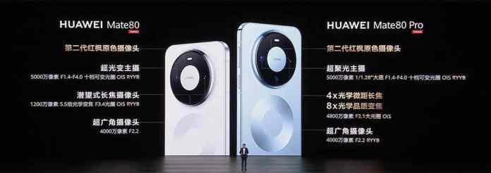 Huawei Mate 80 Pro оснащен основной камерой на 50 МП с сенсором размером 1/1,28 дюйма (f/1,4–4,0, оптическая стабилизация), широкоугольная камера на 40 МП с диафрагмой f/2,2 и телеобъектив на 48 МП с двойным перископом и 4-кратным и 8-кратным зумом.