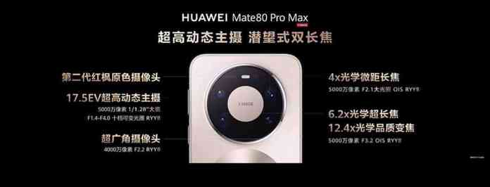 Базовая модель Mate 80 оснащена системой камер, включающей основной датчик на 50 МП с 10-ступенчатой переменной диафрагмой (f/1,4–4,0) и оптической стабилизацией изображения (ОИС), широкоугольная камера на 40 МП с диафрагмой f/2,2, а также перископический телеобъектив на 12 МП с диафрагмой f/3,4 и 1,5-мегапиксельный мультиспектральный датчик Red Maple второго поколения для повышения точности цветопередачи и детализации в различных условиях освещения.