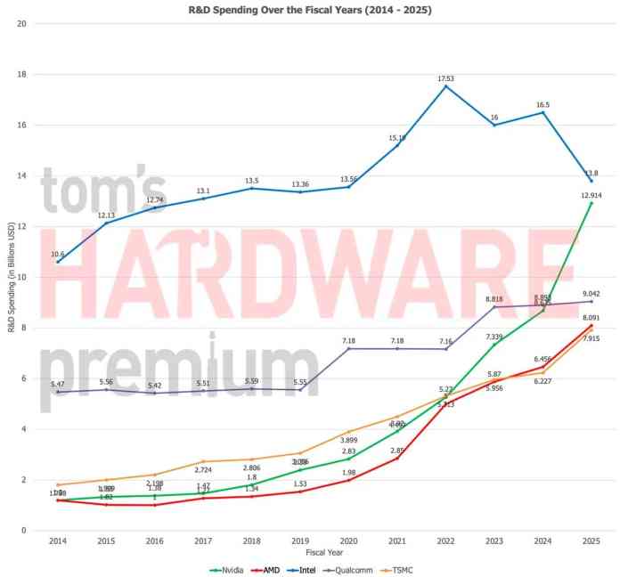 Даже после резкого сокращения расходов на НИОКР в 2025 финансовом году Intel потратила на НИОКР 13,8 млрд долларов — больше, чем AMD, TSMC, Qualcomm или TSMC. По понятным причинам, после сокращения около 40 000 рабочих мест и закрытия десятков проектов за два года, трудно ожидать, что Intel сохранит инвестиции в НИОКР на прежнем уровне.