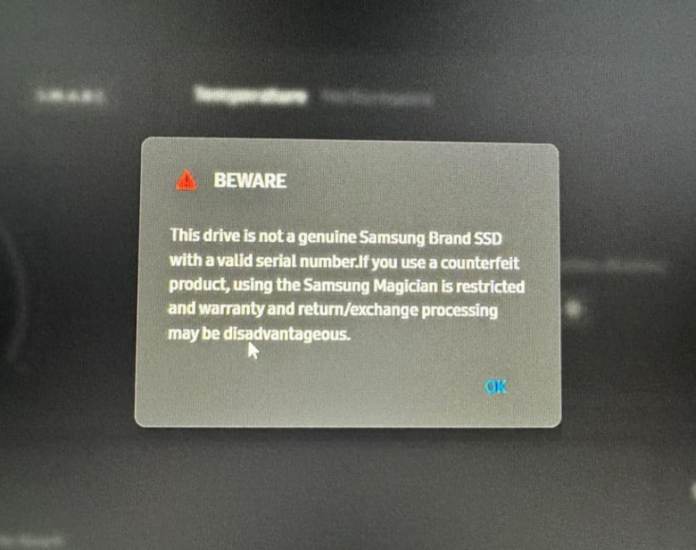 Поскольку SSD был ограничен режимом PCIe 3.0 x4, в идеале скорость чтения должна была достигать не менее 3000 МБ/с. Покупатель проверил диск различными инструментами, но и Windows, и CrystalDiskInfo признали его подлинным. После нескольких шагов по устранению неполадок, таких как обновление драйверов и переустановка SSD-накопителя, он наконец загрузил официальную программу Samsung Magician. После сканирования инструмент пометил устройство как «поддельное». Samsung Magician четко заявляет: «Это устройство не является подлинным твердотельным накопителем марки Samsung с действительным серийным номером.«