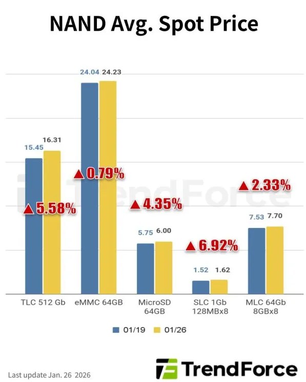 В сегменте NAND участники рынка флэш-памяти также проявляют некоторые колебания, поскольку приближающиеся китайские новогодние праздники могут исключить необходимость приобретения дополнительной памяти. Однако розничные продавцы уверены в возможности дальнейшего роста цен на флэш-память и поэтому не решаются предлагать скидки. На этом фоне объем транзакций NAND снизился. Цена 512-гигабитных чипов TLC на спотовом рынке на прошлой неделе выросла на 5,58% до $16,30.