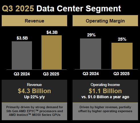 Выручка серверного сегмента AMD в прошлом квартале составила $4,3 млрд, что на 22% больше, чем в прошлом году, и превзошло ожидания аналитиков. Операционная прибыль компании в серверном сегменте достигла $1,07 млрд по сравнению с операционным убытком в $155 млрд в предыдущем квартале. В третьем квартале доходы AMD от серверов были обеспечены не только поставками ускорителей Instinct MI350, но и процессоров EPYC пятого поколения.