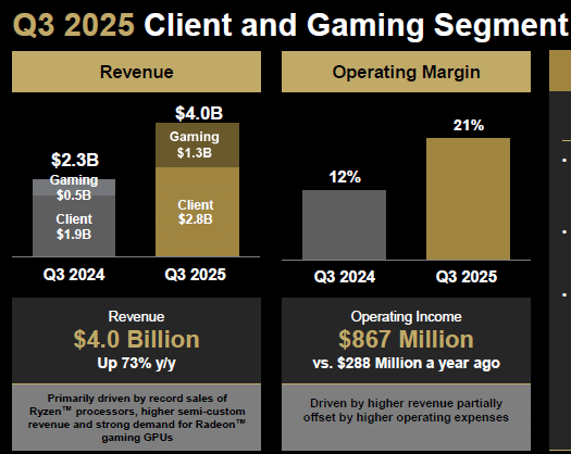 В потребительском и игровом сегментах, которые объединены в финансовой отчетности компании, выручка выросла на 73% в годовом исчислении до $4,05 млрд, а операционная прибыль утроилась до $867 млн. Доходы только в потребительском сегменте выросли на 46,2% до $2,75 млрд, а в игровом сегменте выросли почти до $1,3 млрд. Это было значительно выше ожидаемых аналитиками $1,05 млрд. По мнению Лизы Су, такая динамика доходов игрового сегмента объясняется усилиями Microsoft и Sony увеличить производство своих игровых консолей перед сезоном праздничных покупок. Руководитель AMD также отметил, что в будущем с точки зрения выручки сегмент ПК будет расти быстрее, чем остальной рынок. По данным Gartner, ожидается, что мировой рынок ПК вырастет на 8% в третьем квартале. В любом случае, рост выручки AMD в клиентском сегменте в третьем квартале был также обусловлен рекордными продажами процессоров Ryzen.