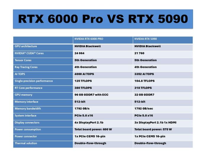 Прямое сравнение с параметрами самой мощной игровой видеокарты Nvidia-Geforce RTX 5090-Give-преимущество RTX 6000 Pro с около 20% в теоретических показателях. Кроме того, в профессиональном решении есть один видеокодер и два декодера больше, чем его игровая эквивалент.