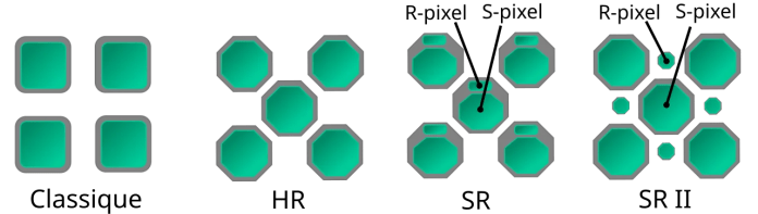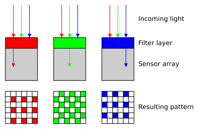 Для синтеза цветного изображения перед пикселями ПЗС-матрицы ставятся цветовые фильтры RGB: