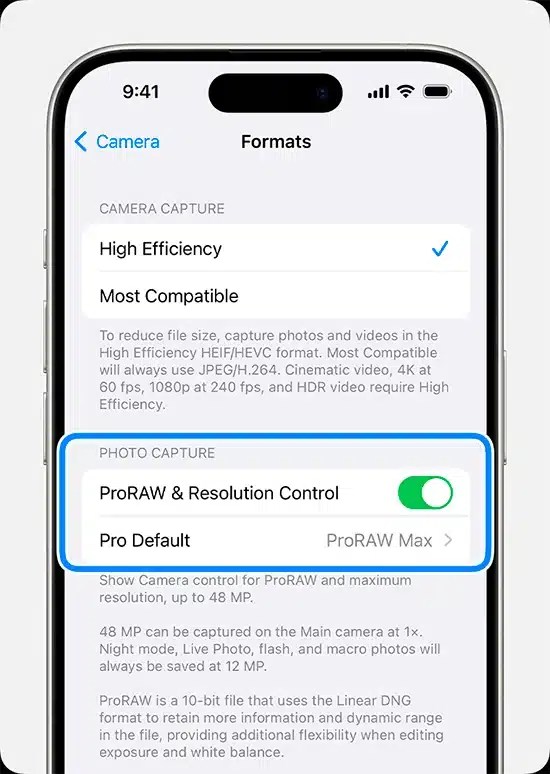 В 2020 году Apple выпустила iPhone 12 Pro и iPhone 12 Pro Max с поддержкой фирменного формата Apple ProRAW. На самом деле есть два варианта: традиционный Bayer RAW и Apple ProRAW, оба из которых сохраняют в 12-битный файл DNG. Опция активируется в настройках камеры: