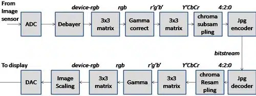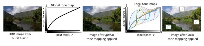 - воспроизведение тона — преобразование сцены с широким динамическим диапазоном в 10 и более бит для отображения на мониторах с низким динамическим диапазоном или для печати; обработка включает отдельные этапы тональной компрессии и гамма-сжатия;