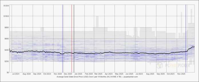 Например, твердотельный накопитель Crucial P310 4TB на базе PCIe 4.0 стоит около $341, т.е. немного дороже внешнего USB-накопителя, но обеспечивает существенно лучшую производительность. Как показывают графики на сайте PCPartPicker, за последние 18 месяцев цены на твердотельные накопители SATA емкостью 4 ТБ упали не так сильно, как цены на NVMe и внешние твердотельные накопители. Наоборот, они сейчас растут вместе с ценами на более быстрые типы памяти, а SATA теряет главное преимущество – более низкую цену.