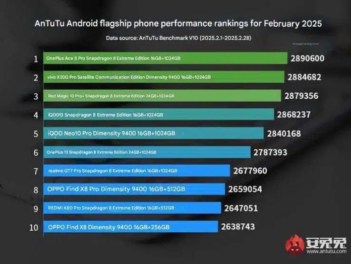 В февральском рейтинге Antutu для выступления флагманов в 2025 году Qualcomm Snapdragon 8 Elite заняла первое место, опередив Dimally 9400 Mediatek, что кратко превысило рейтинг в январеС Что действительно удивительно, так это то, что устройство, которое возглавляет рейтинг, не является флагманом. Его OnePlus Ace 5 Proразработан для достижения высокой производительности. Телефон получил впечатляющие 2 890 600 баллов прямо перед Vivo X200 Proкоторый использует Dimally 9400 Mediatek и получил 2 884 682 балла.