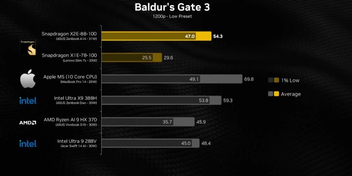 В игре Baldur’s Gate 3 в разрешении 1200р(низкие настройки) Snapdragon X2E-88-100 достиг среднего FPS 54,3 и минимального 47,0. Это больше, чем у Snapdragon X1E-78-100, который показал 29,6 и 25,5 FPS соответственно. График также показывает, что Snapdragon X2E превосходит Ryzen AI 9 HX 370 как по средним показателям (45,9 кадров) и минимальным (35,7 кадров) бенчмарках, отставая от Intel Ultra X9 388H (Средняя скорость 59,3 кадра в секунду, минимум 53,8 кадра в секунду) и Apple M5 (Средняя скорость 69,8 кадров в секунду и минимальная 49,1 кадров в секунду).
