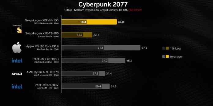 В Cyberpunk 2077 в разрешении 1200p (средние настройки, низкая плотность толпы, трассировка лучей отключена, производительность FSR 3) Snapdragon X2E-88-100 показал средний FPS 40,0 и минимальный 18,4. Для сравнения, Snapdragon X1E-78-100 достиг значений 22,1 и 15,9 FPS соответственно. По сравнению с процессорами x86 Snapdragon X2E показал средний FPS выше, чем у Ryzen AI 9 HX 370 (31,4 кадра) и Ультра 9 288В (34,8 кадров), но его минимальная частота кадров (1%) составила 18,4 – ниже, чем у остальных.