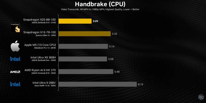 В Handbrake X2 Elite завершил тест за 3 минуты 29 секунд, а Apple M5 — за 5 минут и 14 секунд. Та же история с Intel и AMD: X2 Elite значительно опережает конкурентов.