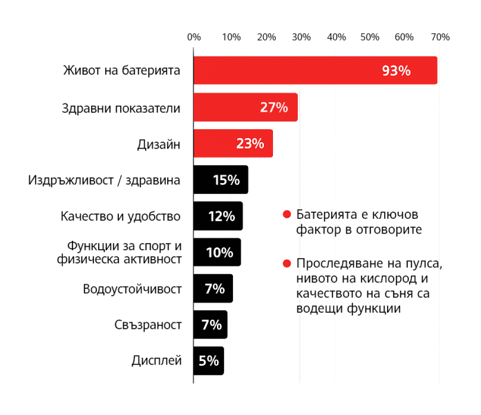 Наиболее важным показателем выбора такого аксессуара была батарея и, в частности, его долговечность. Срок службы батареи упоминался как ключевой фактор в 93% ответов. Huawei является одним из лидеров этого показателя рынка для всех моделей из его все более богатого портфеля. Например, варианты с диаметром 45 мм и 46 мм, от сериалов, таких как Huawei Watch GT 5 (Pro) и наблюдают за GT 4, и длятся до 14 дней без перезарядки, в то время как женские 41 мм и 42 мм имеют около недели срока службы батареи. Неделя до 10 дней — это срок службы моделей серии Huawei Fit 3, а модели Huawei Watch Ultimate Series имеют особый режим длительного срока службы батареи, который может обеспечить целых 3 недели от некоторых функций.