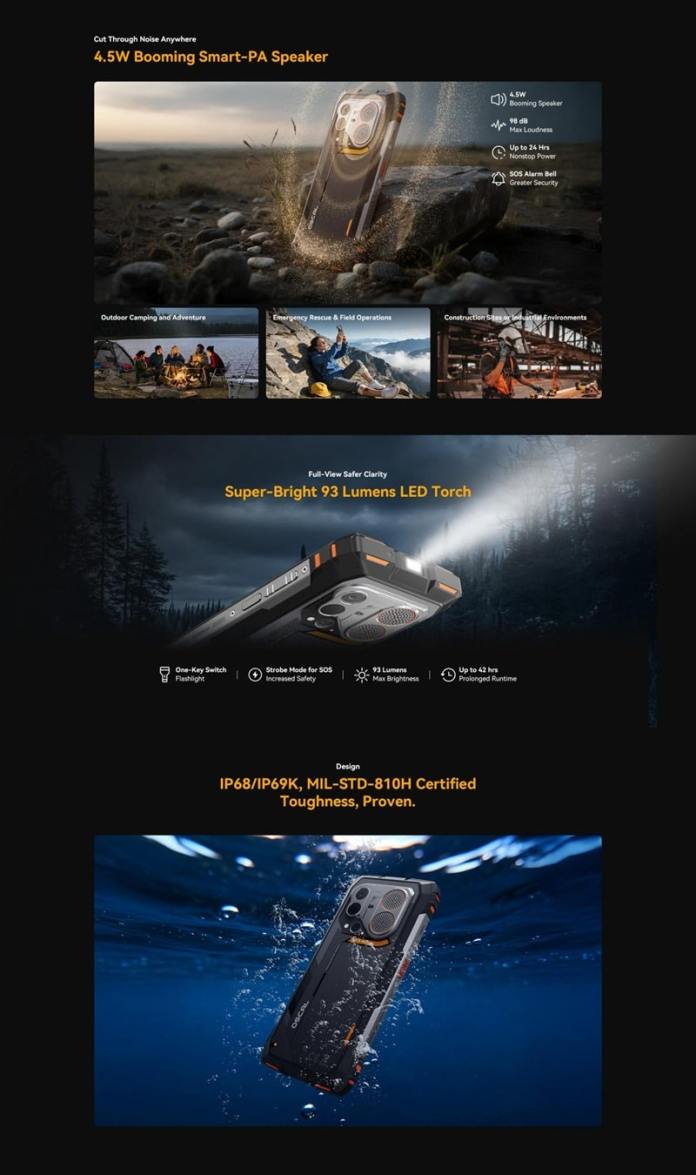 Для любителей путешествий доступен встроенный светодиодный фонарик мощностью 93 люмен с дальностью света 5 метров, обеспечивающий освещение во время кемпинга или похода. Устройство оснащено динамиком мощностью 4,5 Вт.