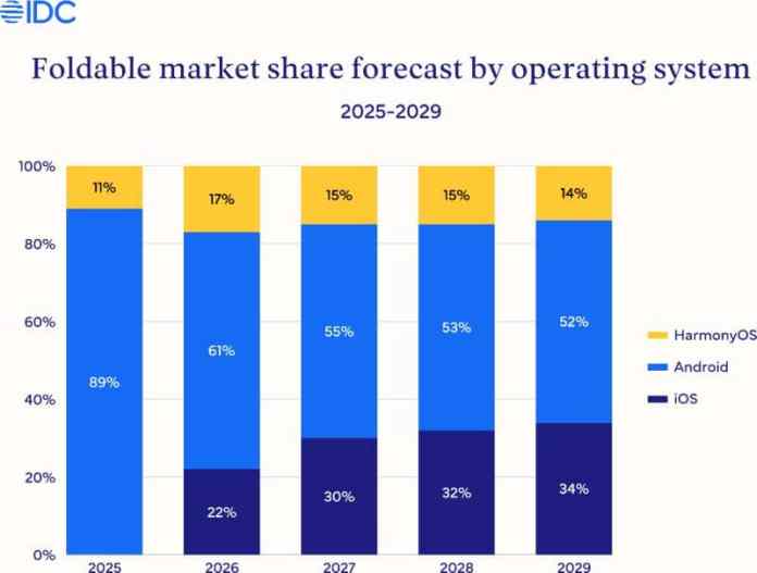 Если Apple сохранит складные iPhone в своей линейке продуктов до 2029 года, на их долю будет приходиться 34% рынка с точки зрения доли операционной системы (iOS). К 2026 году их доля может достичь 22%, что для дебюта весьма впечатляюще. Между тем, складные смартфоны с Google Android постепенно снизят свою долю с нынешних 89% до 52% к 2029 году. HarmonyOS будет иметь 11% к концу этого года и 14% к концу десятилетия.