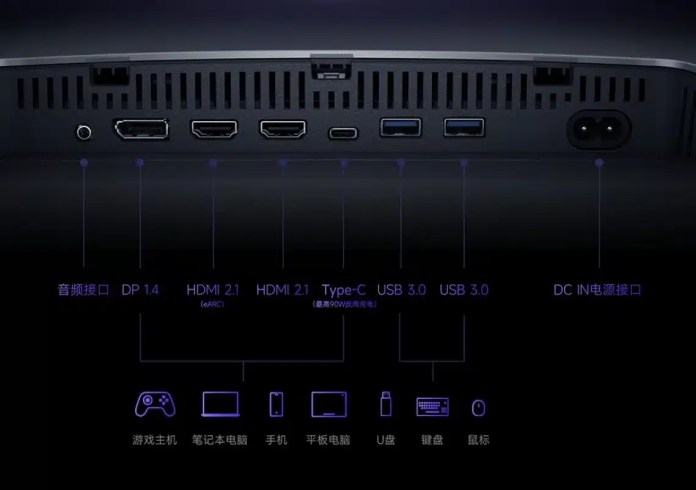 Для подключения предусмотрены два порта HDMI 2.1 (4K при 160 Гц), DisplayPort 1.4, USB-C с поддержкой зарядки мощностью 90 Вт, два порта USB 3.0 и классический разъем для наушников 3,5 мм. Встроенная аудиосистема включает в себя два динамика мощностью 5 Вт с поддержкой DTS:X, а для внешних аудиосистем доступен Dolby Atmos.