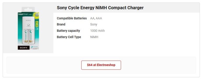 Для фотоаппаратов или чего-либо, потребляющего большой ток, правильным выбором будут NiMH и FR6 (литиевые) батареи типа АА. Преимущество NiMH заключается в возможности перезарядки, что делает их лучшим выбором в долгосрочной перспективе. Единственная проблема заключается в том, что вам понадобится подходящее зарядное устройство, если у вас его еще нет. Я использую зарядное устройство Camelion на 4 гнезда и зарядное устройство Sony на 2 гнезда — оба отлично работают с батареями AA и AAA.
