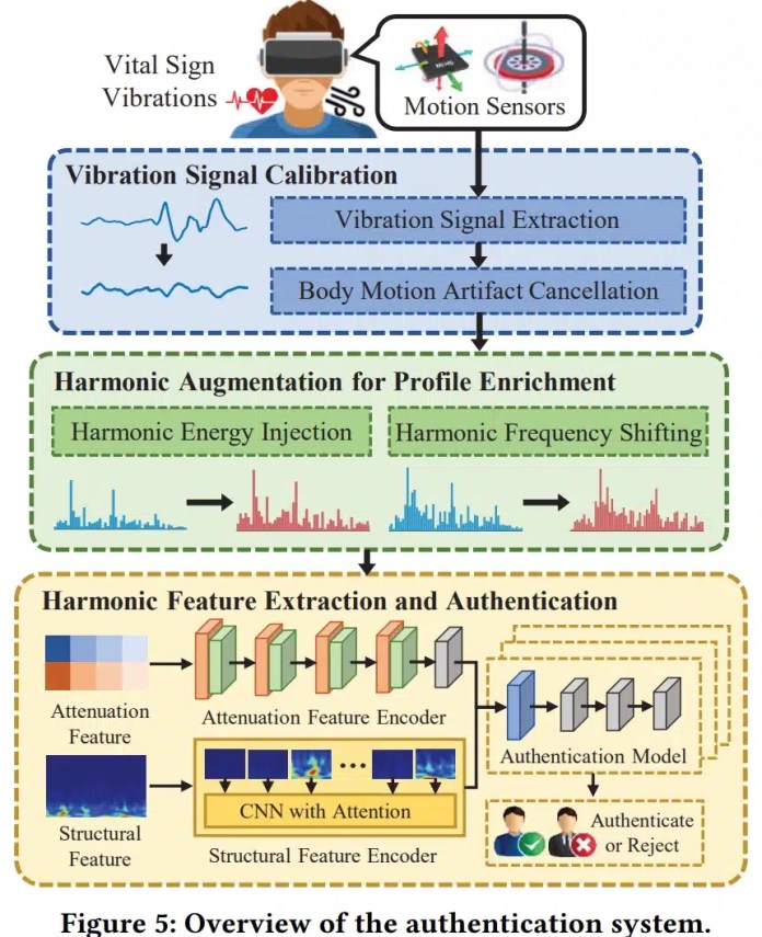 Для команды Рутгерса подход VitalID является продолжением более широкой линии исследований в области «вибрационной биометрии» для устройств XR. Он основан на анализе так называемых гармоник жизненно важных сигналов – не только основных колебаний сердцебиения и дыхания, но и кратных их частот, образующихся при их прохождении через костные структуры черепа. Эти гармоники считаются более стабильными показателями, поскольку они менее зависят от мгновенных изменений ритма дыхания или движений пользователя.